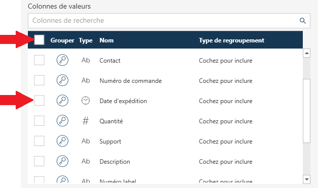 Pour sélectionner toutes les colonnes, cochez la case de la ligne d’en-tête. Remarquez que cette option est désactivée si vous sélectionnez les colonnes par recherche (en y appliquant donc fondamentalement un filtre).