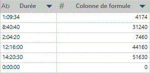 Dans cet exemple, Durée est la colonne d'origine et Colonne de formule contient les valeurs converties :