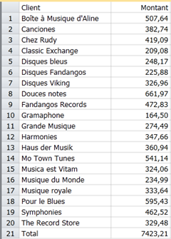 Un récapitulatif affiche des informations résumées sur un ou plusieurs champs dans une matrice uni- ou bidimensionnelle. Le récapitulatif unidimensionnel illustré ci-dessous pour un distributeur de musique affiche les totaux de ventes par client.