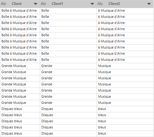 Dans cet exemple, Client est la colonne d’origine. Nous fractionnons la colonne en 2 colonnes (Client1 et Client2) à partir de la gauche en utilisant un espace comme séparateur et une limite de fractionnement de 1 (c.-à-d. fractionner la valeur à la première occurrence du séparateur).