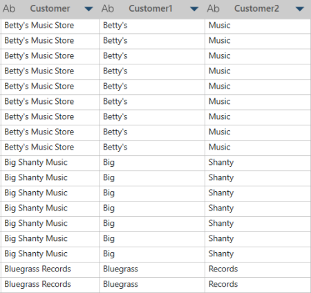 Dans cet exemple, Customer (Client) est la colonne d’origine. Nous fractionnons la colonne en 2 colonnes (Customer1 et Customer2) à partir de la gauche en utilisant un espace comme séparateur et une limite de fractionnement de 2 (c.-à-d. fractionner la valeur aux deux premières occurrences du séparateur). Notez comment, par rapport à l’exemple ci-dessus, les valeurs dans Customer2 semblent « tronquées ». Si nous avions spécifié un nombre de colonnes de 3, la valeur complète de la colonne Customer s’afficherait dans trois colonnes. Dans ce cas, les lignes correspondant à Bluegrass seront vides dans la troisième colonne.