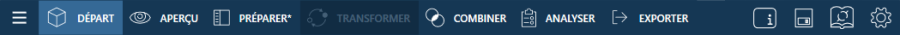 Monarch Data Prep Studio est doté de cinq fenêtres (Départ, Aperçu, Préparer, Combiner et Exporter) qui correspondent à cinq actions dont le but est l’intégration, la préparation et la transformation des données. Ces cinq fenêtres sont accessibles depuis la barre d’outils. La fenêtre Conception de l’état n’est proposée qu’à l’ouverture d’un document PDF.