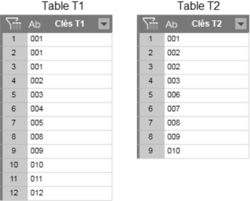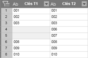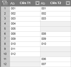 Si vous voulez effectuer une simple recherche, sélectionnez un type de jointure Recherche. Pour illustrer les types de jointure de recherche ci-dessous, considérez l’exemple suivant (seules les clés sont affichées pour plus de simplicité) :