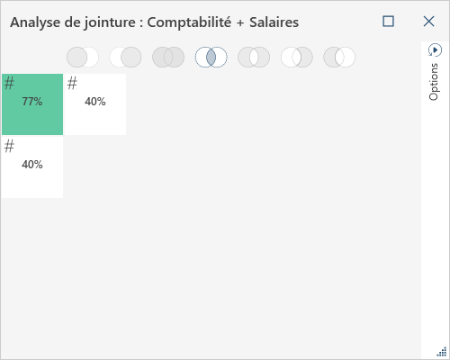 Cette boîte de dialogue indique quels champs produiront les meilleurs résultats (plus la valeur de pourcentage est élevée, plus il y aura de lignes jointes par une combinaison de clés de jointure). Pour déterminer la combinaison de jointure de champ, placez le curseur de votre souris sur une valeur exprimée en pourcentage :
