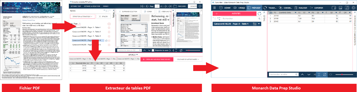 L’application permet d’identifier les tables dans les fichiers PDF chargés de texte, de les sélectionner et de les modifier si nécessaire, puis de les exporter vers Monarch Data Prep Studio pour achever la préparation des données.