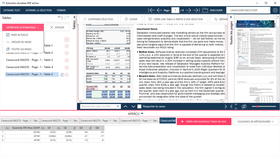 Choisissez Définition automatique > Toutes les pages pour rechercher puis définir automatiquement toutes les tables comprises dans le document. Remarquez que ce processus peut prendre du temps, surtout si le document comporte de nombreuses tables et pages.