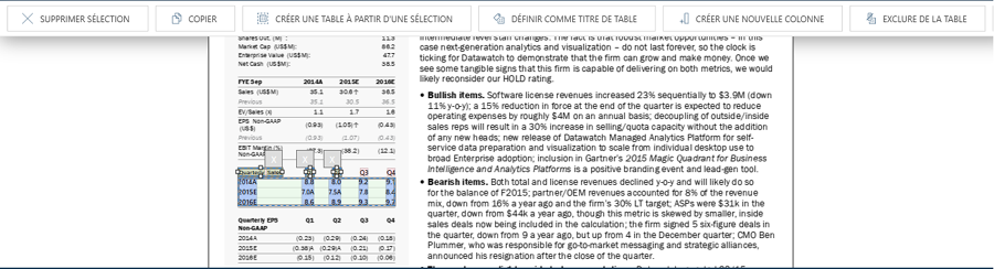 Le texte sélectionné s’associe aux en-têtes de colonne de la table et s’affiche en tant que tel sur le panneau des tables.