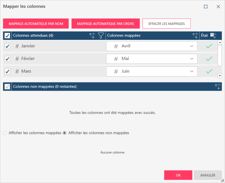 Vous pouvez mapper les colonnes automatiquement par nom ou par ordre. Pour ce faire, cliquez sur le bouton correspondant dans la boîte de dialogue Mapper les colonnes.