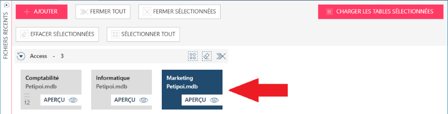 Pour charger des tables dans votre espace de travail, sélectionnez les tables, puis cliquez sur Charger les tables sélectionnées (bouton numéro 7 du diagramme) ou sur Ajouter les tables sélectionnées (bouton numéro 8 du diagramme).