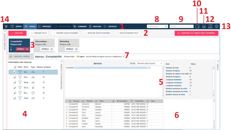 Pour consulter les informations relatives à une colonne, sélectionnez la colonne sur le panneau Information de colonne (panneau numéro 4 du diagramme) :