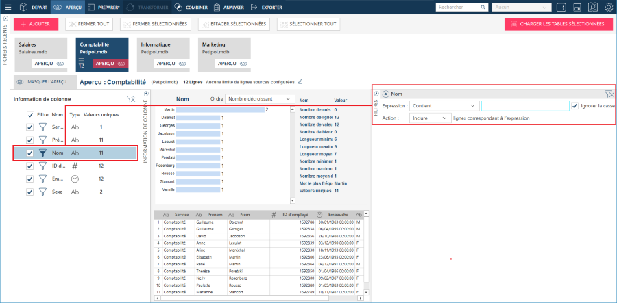 Les tables que vous avez chargées sont disponibles dans les fenêtres Combiner et Préparer.
