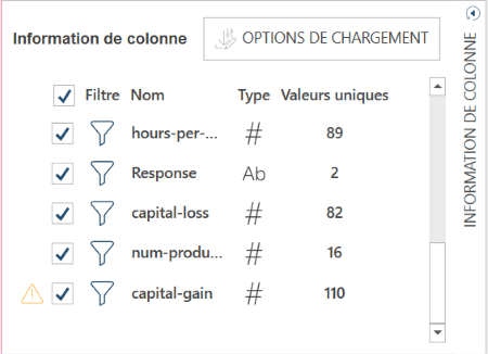 Pour retrouver des erreurs potentielles dans vos données, faites défiler le panneau Information de colonne (panneau numéro 4 du diagramme) à la recherche des colonnes assorties de l’icône d’avertissement :