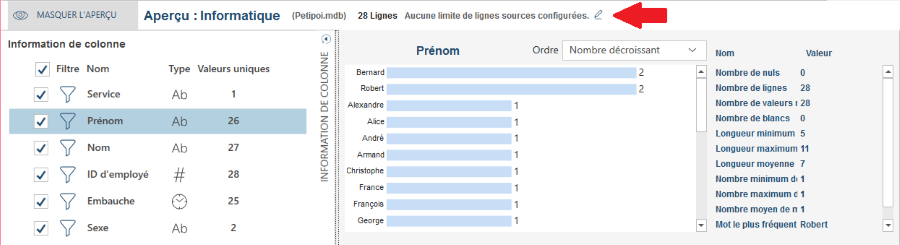 Vous pouvez limiter le nombre de lignes à exploiter en cliquant sur l’icône Modifier en regard de Aucune limite de lignes sources configurées :