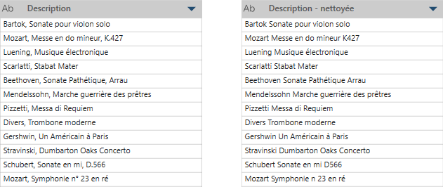 Dans cet exemple, Description est la colonne d'origine et Description - nettoyeé est la nouvelle colonne obtenue après application de la fonction Supprimer les caractères non alphanumériques :