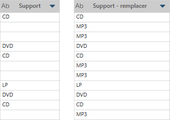 Dans cet exemple, Support est la colonne d'origine. L'opération Remplacer les valeurs blanches a été utilisée pour supprimer les valeurs nulles et les remplacer par MP3, afin de produire les valeurs suivantes qui se trouvent dans la colonne Support – remplacer :