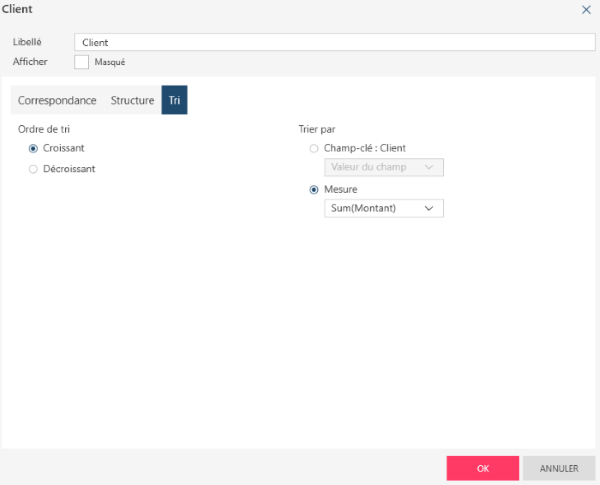 Les champs qui composent votre définition de récapitulatif et peuvent être triés s’affichent dans les panneaux Lignes, Éléments et Colonnes de ces boîtes de dialogue. Les mesures ne peuvent pas être triées.