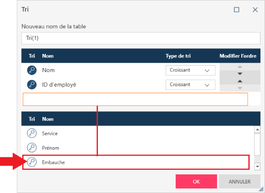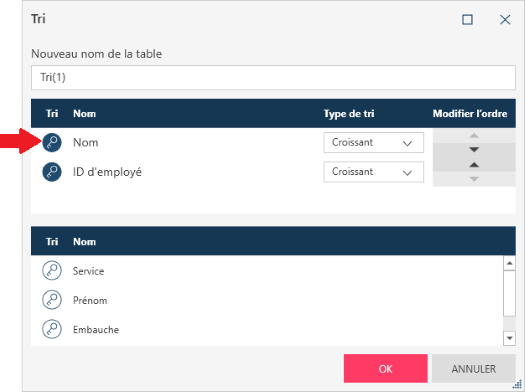 Monarch Data Prep Studio effectue le tri en fonction de l’agencement des colonnes de tri. Vous pouvez en changer l’ordre en cliquant sur les flèches haut/bas en regard d’une colonne.