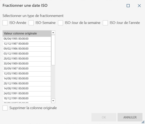 Fractionne un champ date/heure en deux, ou en colonnes, en fonction des composants date/heure ISO 8601 sélectionnés.