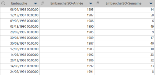 Dans cet exemple, Embauche est la colonne date/heure d’origine. Nous avons fractionné cette colonne en deux colonnes, en fonction de l’année ISO et de la semaine ISO, pour obtenir EmbaucheISOAnnée et EmbaucheISOSemaine.