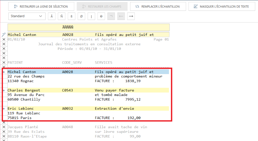 Lorsqu’un masque, comme un masque de détails, doit être créé après que des masques Début de région et Fin de région ont été spécifiés, seule la section entre les lignes commençant par « Michel » et se terminant par « Paris » est marquée pour une possible sélection.