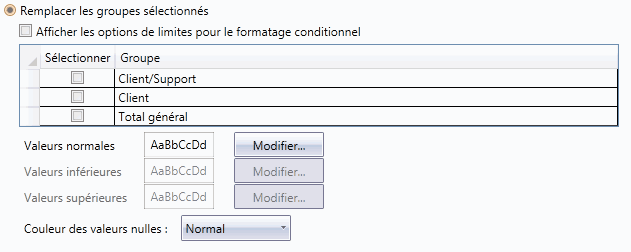 Sélectionnez les groupes que vous souhaitez colorer puis cliquez sur Modifier à côté de la zone d'aperçu des valeurs normales pour afficher la boîte de dialogue Propriétés des couleurs. Servez-vous de cette boîte de dialogue pour définir la couleur du texte, la couleur de remplissage, le style de motif et la couleur du motif. Sélectionnez également des valeurs pour Couleur des valeurs nulles afin de définir la couleur des champs de valeurs nulles. Définition des couleurs pour le formatage conditionnelSi vous souhaitez définir des couleurs pour le formatage conditionnel, cliquez sur Afficher les options de limites pour le formatage conditionnel. L'écran vous permettra d'indiquer les limites inférieure et supérieure pour chaque groupe :
