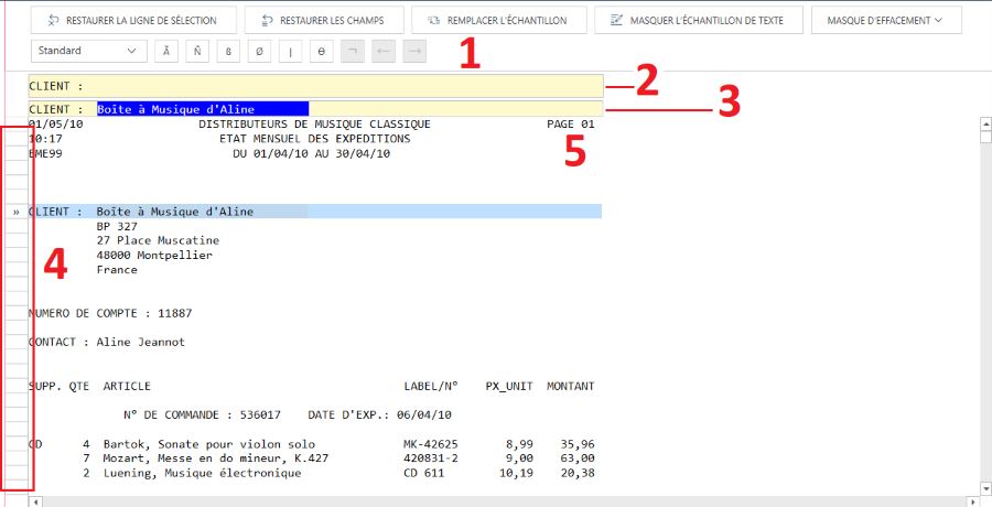 Affiche une ligne d’échantillon de l’état. Cette ligne d’échantillon sert de base pour définir le sélecteur. Sélectionnez un échantillon qui reflète le mieux le type de ligne en particulier (par ex. détail de l’état ou en-tête de l’état) de l’état. Si vous cliquez n’importe où dans cette ligne avec le bouton droit, un menu vous permettant de tirer/pousser les limites de champ vers la gauche/droite ou de supprimer/effacer les champs s’affiche. |
