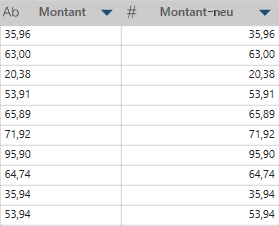 Dans cet exemple, Montant est la colonne d’origine et Montant-neu contient les valeurs converties.