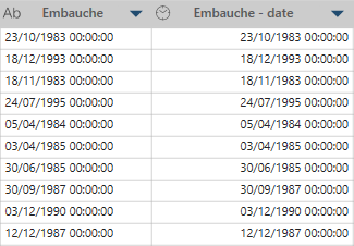 Dans cet exemple, Embauche est la colonne d’origine et Embauche - date contient les valeurs converties.