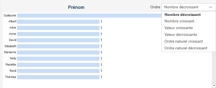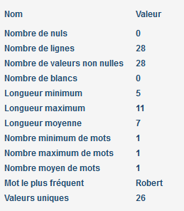 Pour les colonnes numériques, les statistiques suivantes s’affichent :