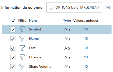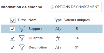 Information de colonne Ce panneau affiche une liste des colonnes de la table se trouvant dans l'aperçu. Il présente les noms des colonnes, le type de données de chaque colonne, et le nombre de valeurs uniques de chaque colonne. Remarque :