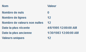 Pour les colonnes de date/heure, les statistiques suivantes s’affichent :