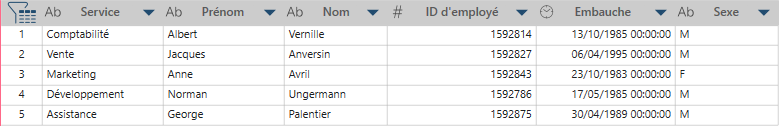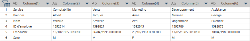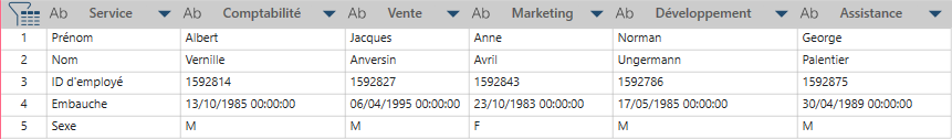 Chaque ligne Employé associée au service devient une colonne et toutes les valeurs de ligne s’affichent sous chaque service.