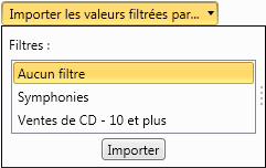 Vous pouvez sélectionner Aucun filtre dans la liste des filtres puis cliquer sur Importer afin de remplir automatiquement la liste des valeurs avec toutes les valeurs du champ. Ou vous pouvez sélectionner un filtre puis cliquer sur Importer, afin de remplir automatiquement la liste avec un sous-ensemble des valeurs du champ.