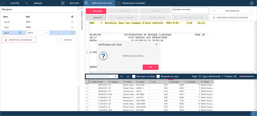 La fenêtre Vérification de l’état affiche l’état de l’opération. Si la vérification détecte une erreur de limite de champ, la fenêtre Vérification de l’état permet de la corriger, puis de reprendre l’opération.