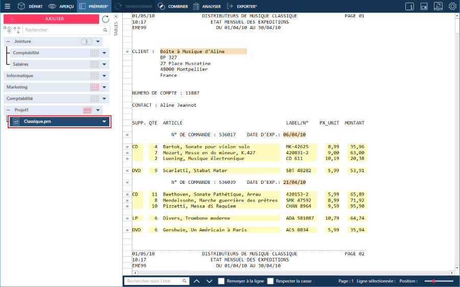 Les données d’états associés à un fichier Monarch Classic s’affichent sous forme de tables dans la fenêtre Préparer mais elles ne peuvent pas y être préparées.