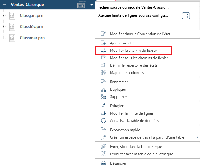 Pour modifier le chemin d’un fichier d’état, cliquez sur la flèche de liste déroulante à côté du nom de la table principale et choisissez Modifier le chemin du fichier.