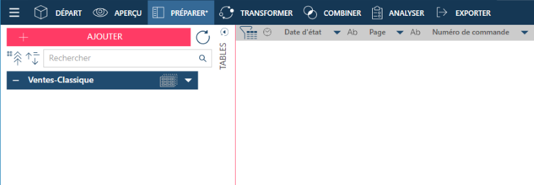 Vous pouvez préparer, transformer et combiner les données uniquement si vous sélectionnez la table principale. Vous ne pouvez que visualiser les données si vous sélectionnez un état (sans préparation, transformation ni combinaison admise).
