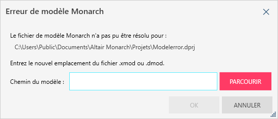 Si vous ouvrez un projet dont le modèle ne peut pas être localisé, Monarch Data Prep Studio ouvre une boîte de dialogue indiquant que le modèle est introuvable. Cliquez sur le bouton Parcourir pour rechercher le modèle et désigner l’emplacement correct.