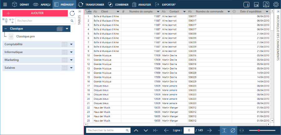 Les Monarch Data Prep Studiodonnées extraites d’un état sont consignées dans une table de base de données que vous pouvez consulter et manipuler dans la fenêtre Préparer de Monarch Data Prep Studio. Ce tableau se compose de lignes et de colonnes de données : chaque ligne représente un enregistrement de base de données et chaque colonne, un champ.