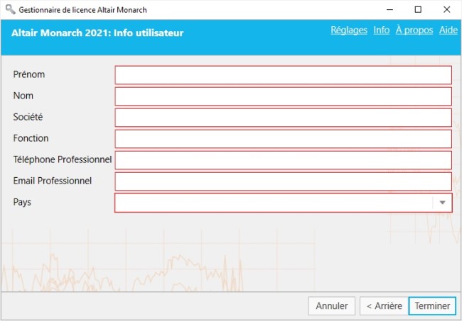Si vous ne désirez pas continuer à utiliser votre produit Altair à ce moment, cliquez sur Annuler dans la fenêtre Information de licence pour la fermer et quitter l’assistant Monarch License Manager.