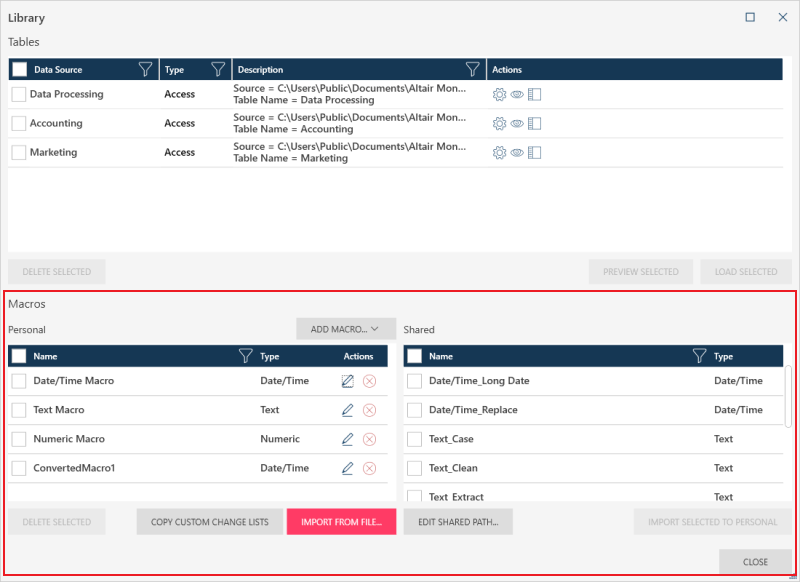 This item also displays when you click Import from File or Edit Shared Path buttons in the Macros section of the Data Source Library.