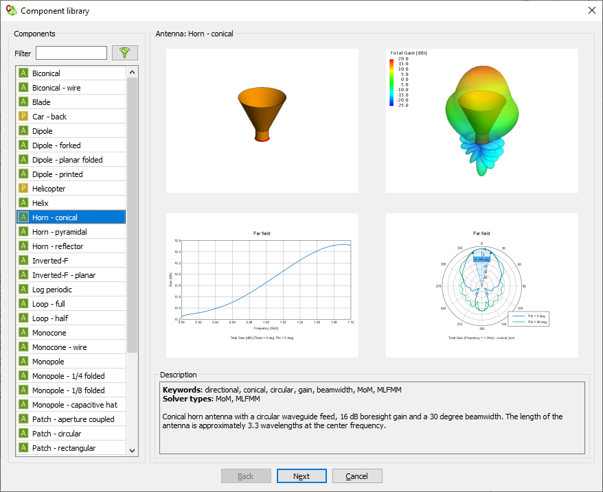 • Introduced a component library that contains a collection of antenna models and platform geometry. The component library can be used to add a component to a new or existing model. When browsing through the components, preview images of the geometry and antenna characteristics are displayed. For antenna models, the centre frequency, solver method and other settings can be changed to facilitate model setup.