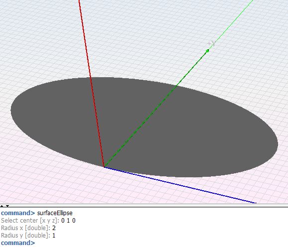 The ellipse option allows the user to create a solid ellipse surface, given the radius along the X axis, the radius along the Y axis and the center point.