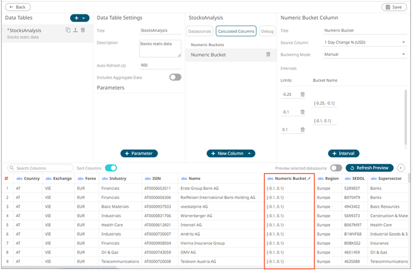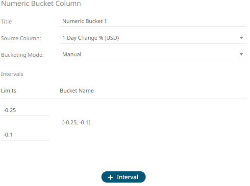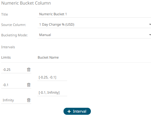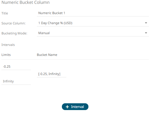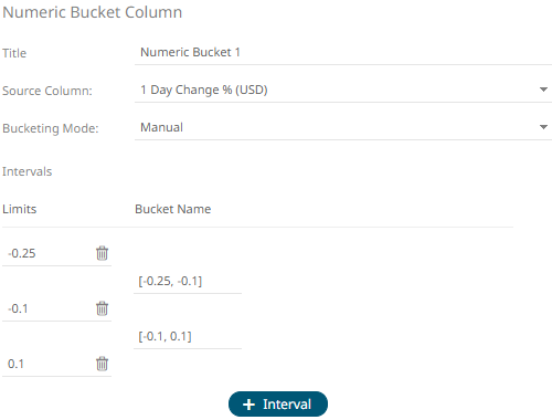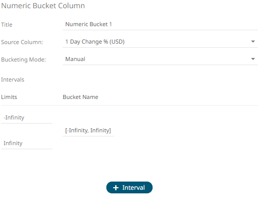 The numeric bucket instance is displayed on the Data Sources Settings with Numeric Bucket as the default title, also the Numeric Bucket Column pane displays.