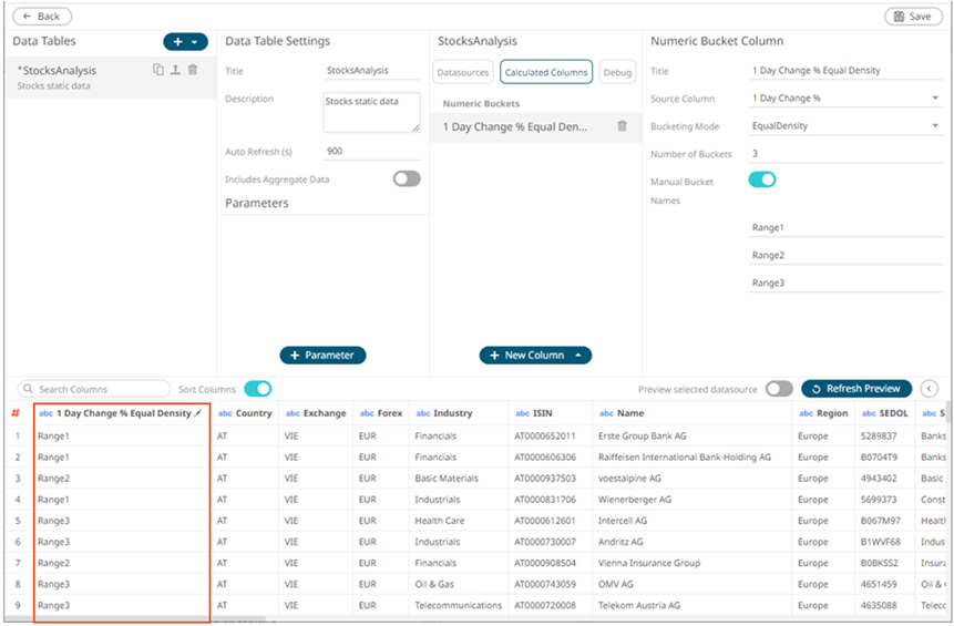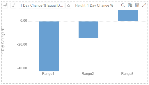 For this example, the minimum value of the Source Column (1 Day Change %) is -0.35 and the maximum value is 0.12. When there are three buckets the ranges will be: