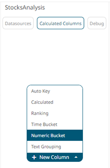 The numeric bucket instance is displayed on the Data Sources Settings with Numeric Bucket as the default title, also the Numeric Bucket Column pane displays.