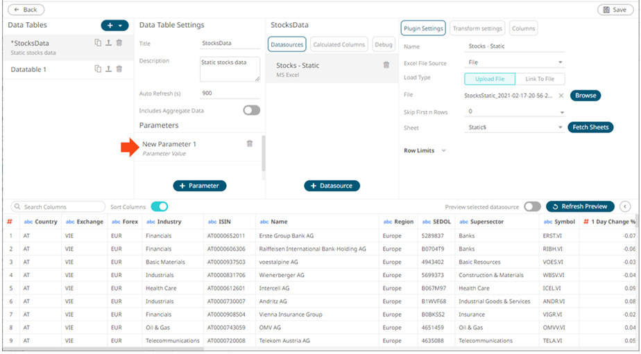 The Data Sources Preview at the bottom of the screen updates based on the default parameter values.