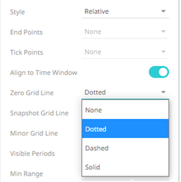 Determines whether a grid line is drawn showing the snapshot location. Allowed values: · None · Dotted · Dashed · Solid When the Snapshot Grid Line is rendered, the Set Snapshot Here option will be available in the visualization context menu in the web client. |