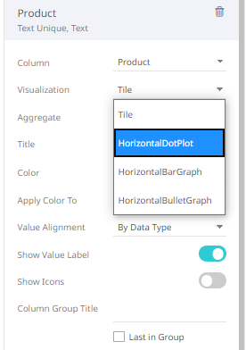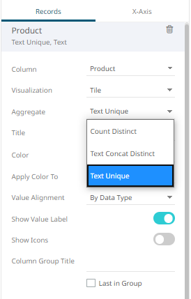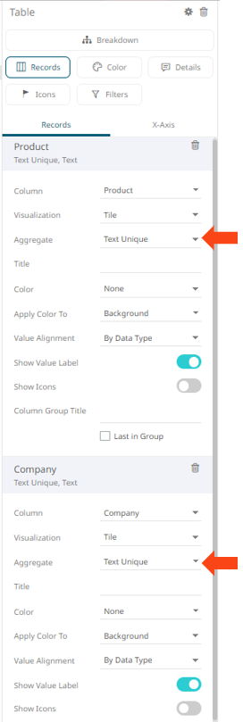 By default, the aggregates of Product and Company are both set to TextUnique.