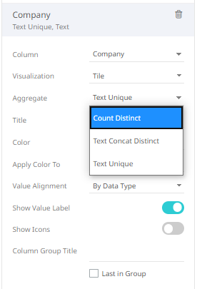 You can also opt display the Company column as a distinct count by clicking Show as Distinct Count. The dialog changes to show numeric properties with Aggregate set to CountDistinct: